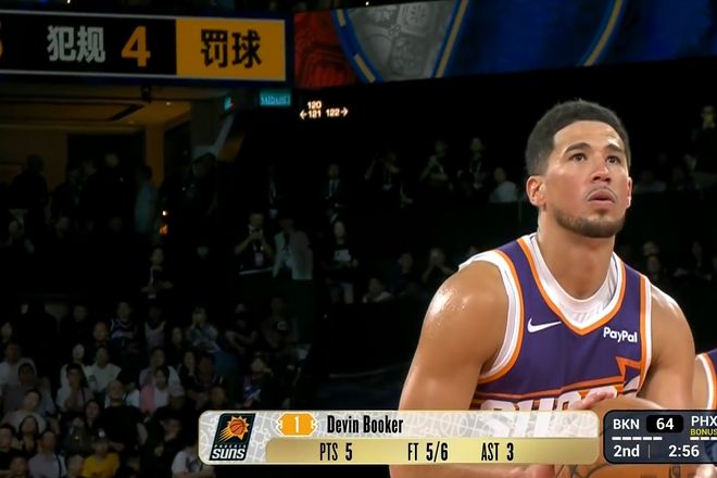 NBA中国赛太阳加时132-127篮网,曾凡博首秀0出手1抢断,布克18分